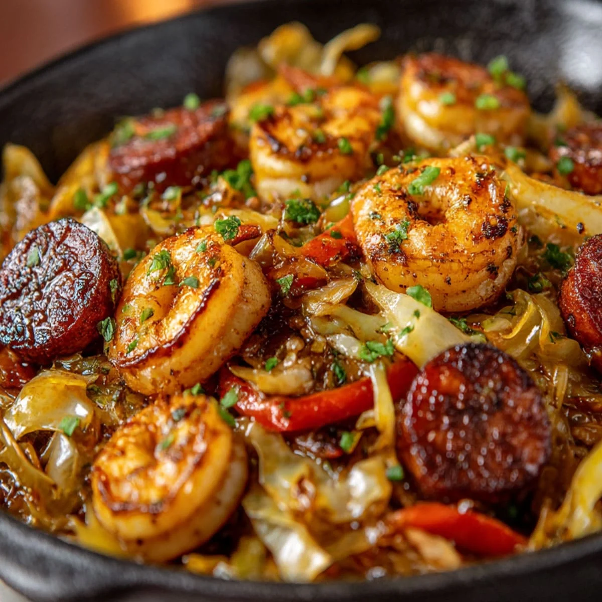 A bold and savory one-skillet meal featuring juicy shrimp, smoky sausage, and tender cabbage with vibrant bell peppers and signature seasoning. Ready in just 30 minutes, it’s perfect for busy weeknights or flavorful meal prep.
