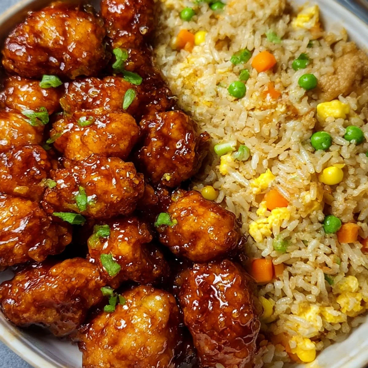 This entire meal comes together in about and sits at a comfortable intermediate difficulty level. You’ll work through three parallel tracks — battering and frying chicken, building a glossy sauce, and stir-frying rice — so read through every step before you start. Expect golden, shatteringly crisp chicken coated in sticky-sweet glaze alongside smoky, egg-laced fried rice that tastes better than delivery.