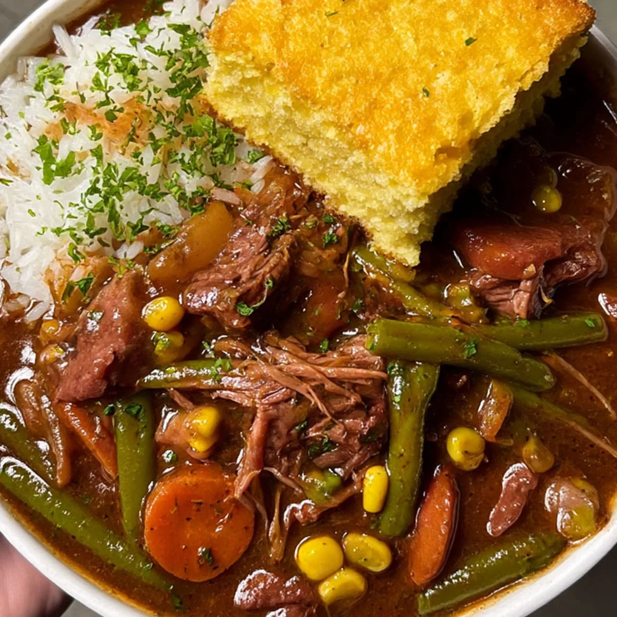 Hearty Beef Stew Bowl with Rice is the kind of dish that brings the whole house to the table with its irresistible aroma and soul-warming richness. Picture this: fall-off-the-bone tender beef neck bones simmered in a velvety tomato-based gravy loaded with sweet carrots, earthy green beans, and bursts of golden corn. All spooned over fluffy white rice, soaking up every savory drop. Now add a thick slice of golden Hatch green chile cornbread to round it all out.