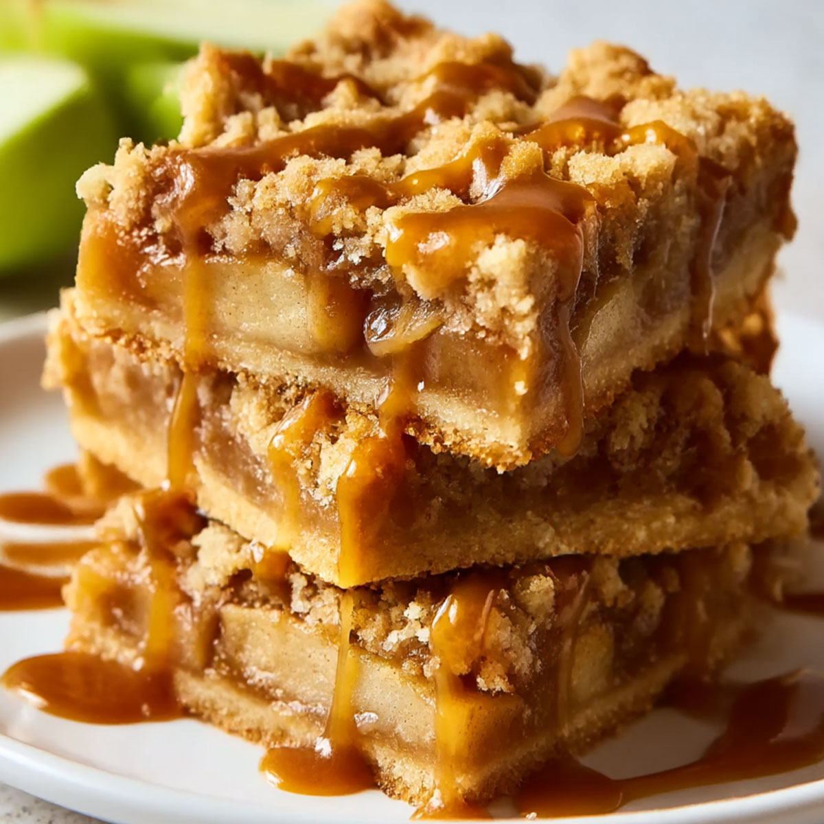 Salted Caramel Apple Pie Bars are an American-style dessert featuring a buttery shortbread base, thinly sliced apples seasoned with cinnamon and nutmeg, and a crisp brown-sugar-oat streusel, finished with a drizzle of salted caramel sauce for a sweet-salty, pie-inspired bar with a tender yet sliceable texture.