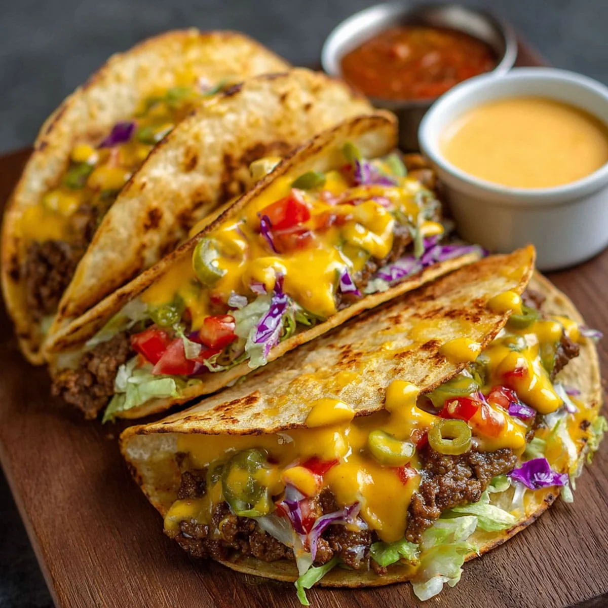 Pair Smash Burger Tacos with refreshing drinks like lemonade or iced tea, a crunchy side salad, and light desserts such as fruit skewers or mini cheesecake bites. They also pair well with dipping sauces like chipotle mayo or burger sauce.